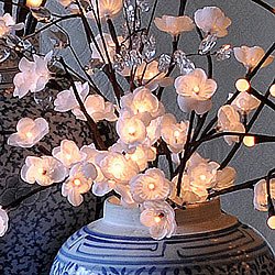 Battery Operated LED White Plum 60 Bulb - 20 Inches high. Runs on 3 AA bateries. Add a sparkle of light to your floral arrangements or plants with this lighted White Plum Tree. Use alone for a dramatic touch to your next party, anniversary, holiday or wedding celebration. Flexible branches can be shaped as desired. Let your creativity "shine"! 20 inches 60 lights, bend branches to shape Uses 3 AA Batteries High - Low Dimmer Switch 20 Inch Lead To Power Pack The battery pack measures 3" X 2" X 3/4". 12+ hour run time. For wedding planning, events, home decorating, endless uses.